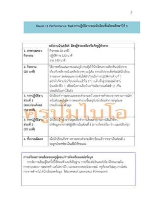 ภาพรวมของ กิจกรรม กิจกรรม 20 นาที ปฏิบัติการ 120 นาที รวม 140 นาที 2. กิจกรรม (20 นาที) ใชภาพหรือแผนภาพ/แผนภูมิ กระตุนใหนักเรียนความคิดเห็น/อภิปราย เกี่ยวกับพลังงานนิวเคลียรจากความรูเดิม การอภิปรายเพื่อชวยใหนักเรียน วางแผนตรวจสอบและกระตุนใหนักเรียนในการปฏิบัติงานสวนที่ 1 อยางไรก็ตามนักเรียนจะตองเขาใจ 2 ประเด็นพื้นฐานของพลังงาน นิวเคลียรคือ 1. เปนหนึ่งทางเลือกในการผลิตกระแสไฟฟา 2. เปน ประเด็นในการโตแยง 3. การปฏิบัติงาน สวนที่ 1 (สอบกอนเรียน) (50 นาที) นักเรียนทําการสอบและตอบคําถามลงในกระดาษคําตอบจากสถานการณตา งๆในอินเตอรเน็ต การตอบคําถามขึ้นอยูกับนักเรียนทําการสรุปและ ประเมินแหลงขอมูล 3. การปฏิบัติงาน สวนที่ 2 (70 นาที) นักเรียนอางอิงจากสมุดเพื่อทําการเขียนรายงานการโตแยงที่พบ นําขอมูลจากการปฏิบัติงานในสวนที่ 1 มาวางโครงเรื่อง ราง และปรับปรุง 4. ขั้นประเมินผล เมื่อนักเรียนคนหา ตรวจสอบคําถามเรียบรอยแลว รายงานในสวนที่ 2 จะถูกนํามาประเมินเพื่อใหคะแนน Grade 11 Performance Task การปฎิบัติงานของนักเรียนชั้นมัธยมศึกษาปที่ 5 การเตรียมความพรอมของครูผูสอน/การจัดเตรียมแหลงขอมูล การจัดการเรียนรูในครั้งนี้ใชคอมพิวเตอรเปนฐาน การเชื่อมตออินเตอรเน็ต มีโปรแกรมใน การตรวจสอบการสะกดคํา แตไมควรมีโปรแกรมตรวจสอบไวยากรณ ครูตองเตรียมอุปกรณเชน กระดาษสําหรับใหนักเรียนจดขอมูล โปรแจคเตอร และชอฟแว Powerpoint