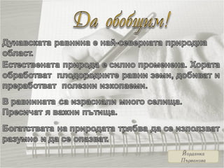 Почви Плодородните почвиса най-голямото богатство на Дунавската равнина. Отглеждат се пшеница, царевица, слънчоглед, зеленчукови градини и лозя. Най-източната част на равнината – Добруджа , е наречена “житница на България” заради високите добиви на пшеница.