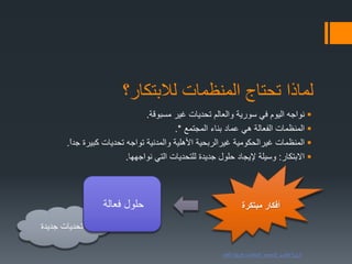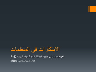 تناقش الوثيقة أهمية الابتكار في المنظمات وكيفية مواجهة التحديات الحالية من خلال أفكار وحلول مبتكرة. تشير إلى قيود الابتكار على المستويات الفردية والفريق والم سازمان. تشمل التوصيات تجاوز القيود الداخلية والخارجية لتعزيز الابتكار وتحسين الحياة المجتمعية.