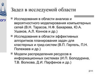 Документ представляет результаты исследований в области программно-конфигурируемых сетей, проведенных в Оренбургском государственном университете, и описывает выполненные проекты и их результаты. В частности, обсуждаются концепции и алгоритмы управления сетевыми ресурсами, а также разработка моделей для распределенных вычислительных центров обработки данных. Исследования поддержаны Министерством образования и науки России в рамках федеральной целевой программы.