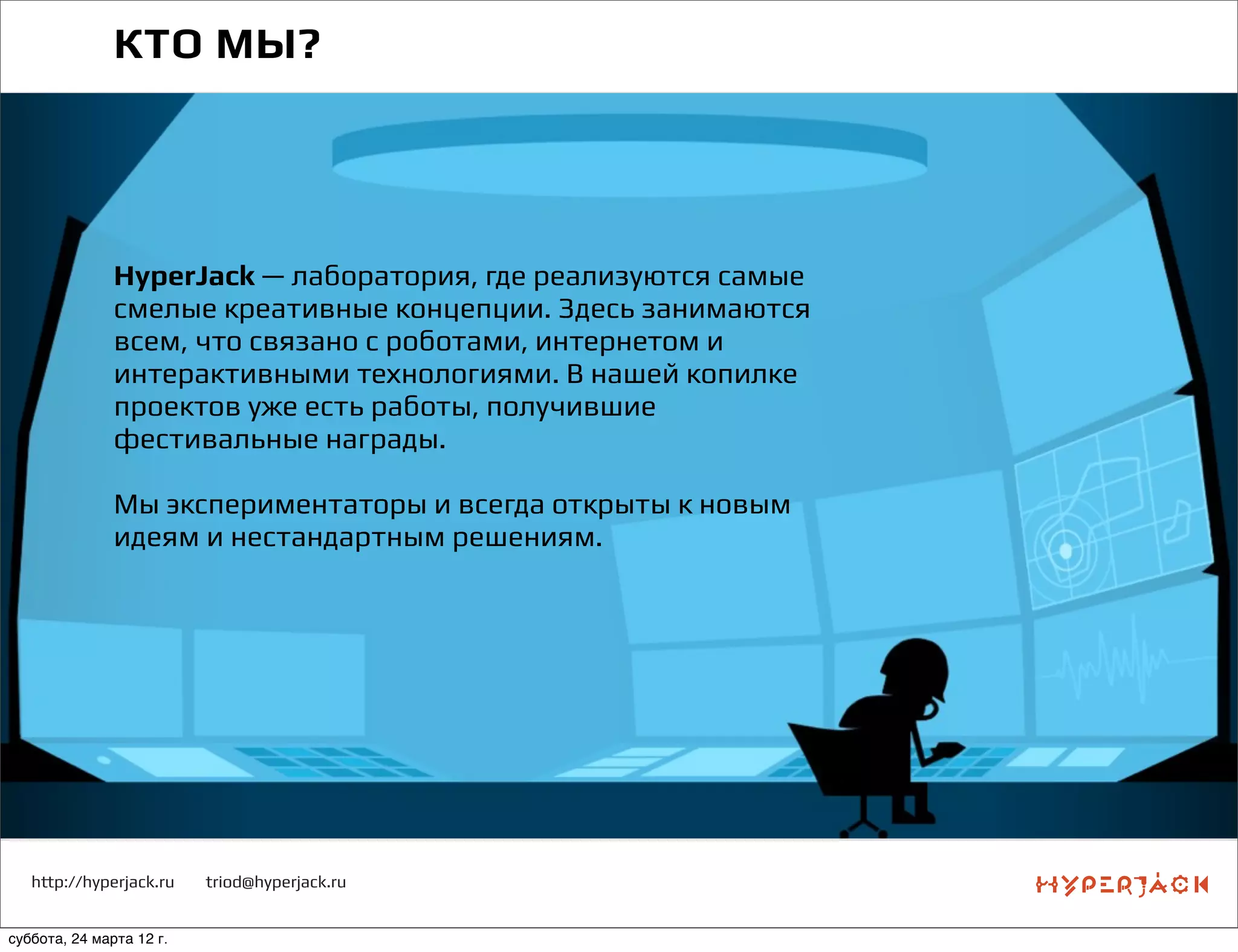 Hyperjack — это лаборатория, специализирующаяся на креативных концепциях в области робототехники и интерактивных технологий. Компания предлагает широкий спектр услуг, включая разработку сайтов и приложений, создание роботизированных объектов и интерактивных стендов, а также видеопродакшн. Hyperjack ориентирован на комплексные решения и реализацию интегрированных рекламных кампаний, обеспечивая клиентам профессиональных менеджеров проектов.