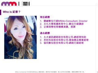 本文件探讨了品牌在社交媒体中的价值和影响力,强调品牌认知与消费者心理的重要性。它还说明了品牌与社交媒体之间的密切关系,以及如何通过有效的议题营销和沟通方法来提升品牌知名度和信任度。最后,持续的品牌管理和信任建立是品牌长期成功的关键。