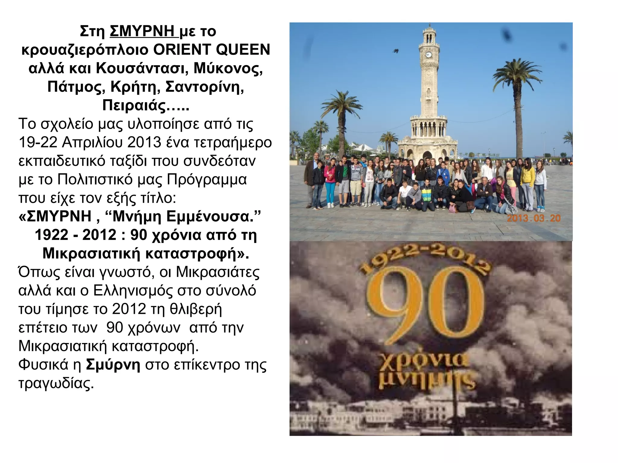 Το 2ο Γυμνάσιο Κορίνθου,τιμώντας την επέτειο της συμπλήρωσης 90 χρόνων από τη Μικρασιατική Καταστροφή, οργάνωσε στα πλαίσια πολιτιστικού προγράμματος, εκπαιδευτική επίσκεψη στην Σμύρνη ,