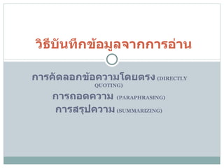 ( DIRECTLY QUOTING) การถอดความ ( PARAPHRASING) การสรุปความ ( SUMMARIZING) วิธีบันทึกข้อมูลจากการอ่าน