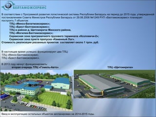 Государственный таможенный комитет Республики Беларусь и РУП «Белтаможсервис» планируют построить 7 объектов логистической инфраструктуры до 2015 года с общей стоимостью около 1 трлн. руб. В 2012 году работающие центры «Минск-Белтаможсервис» и «Брест-Белтаможсервис» показали значительные объемы выручки и прибыли, а новый центр в районе д. Щитомиричи начнет функционировать в 2013 году и создаст 300 рабочих мест с прогнозируемой годовой выручкой в 116 млрд. руб. Основное назначение этих центров включает обслуживание экспортно-импортных грузопотоков, а также проведение таможенного декларирования.
