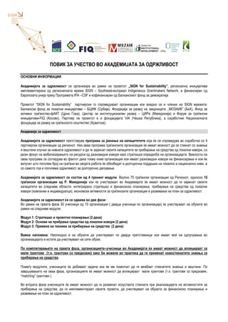 Академијата за одржливост се организира во рамки на проектот „SIGN for Sustainability”, регионална иницијатива имплементирана од регионалната мрежа SIGN – Southeast-european Indigeneous Grantmakers Network,афинансиран од Европската унија преку Програмата IPA –CSFи кофинансиран од Балканскиот фонд за демократија.