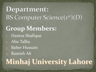 Group Members: 1. Hamza Shafique 2. Abu Talha 3. Babar Hussain 4. Ramish Ali Department: BS Computer Science Semester: 1st Minhaj University Lahore