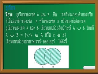 นิยาม ยูเนียนของเซต Aและ B คือ เซตที่ประกอบด้วยสมาชิก