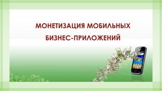 Документ анализирует рынок монетизации мобильных приложений, который значительно вырос за последние годы и прогнозируется его дальнейший рост, в том числе в России. Описываются различные модели монетизации, включая платные и бесплатные приложения, а также аспекты мобильного маркетинга и важные советы для разработчиков. В документе также приводится статистика и тренды в использовании мобильных устройств и приложений.