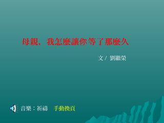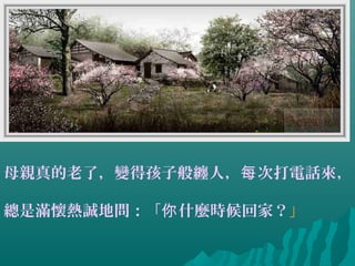 这篇文章描绘了一位子女与老母亲之间的深厚情感,展示了母亲在晚年对儿女的思念与关怀。尽管子女因工作和生活忙碌,难以常回家探望,母亲的牵挂始终未减,甚至在生病期间仍努力为子女的到来做准备。最终,母亲为能与子女再见面而感到满足,她的离去则让子女意识到无论忙碌,亲情始终是生命中不可或缺的部分。