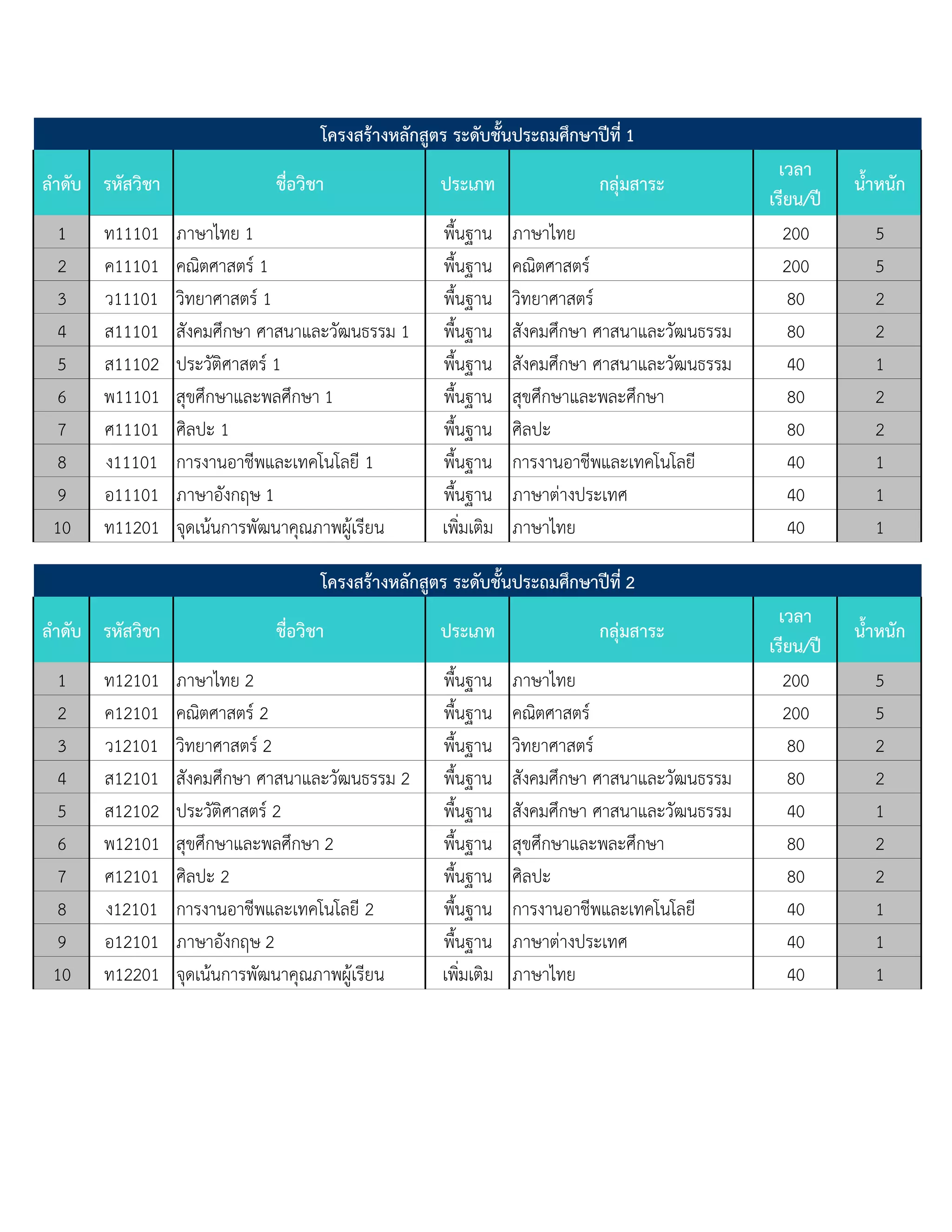 โครงสร้างหลักสูตร ระดับชันประถมศึกษาปีที่ 2