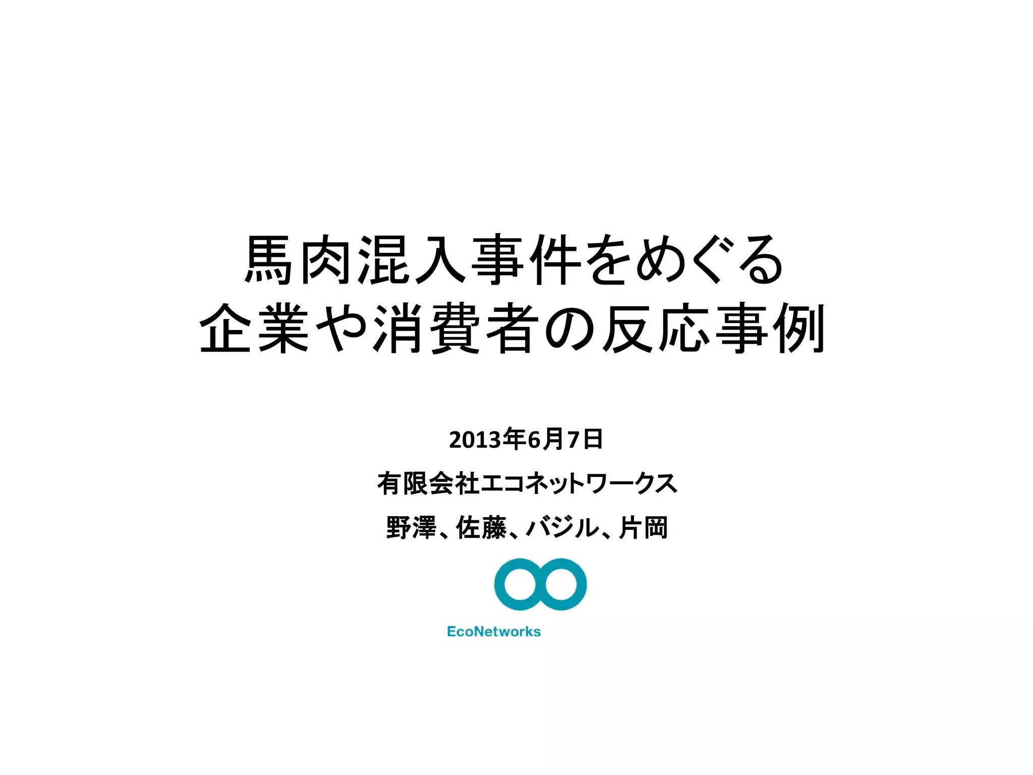アイルランド・英国に始まり、フランス、スペイン、イタリアなど 欧州全土を巻き込む一大スキャンダルとなった「馬肉混入問題」。 フランスとスペインに在住のパートナーの協力を得て、 現地企業の取組み事例や消費者の反応を調べました。 ブログ記事 「馬肉混入事件をめぐる欧州企業・政府・市民の反応」 http://www.econetworks.jp/internatenw/2013/06/eu_horse_meat/