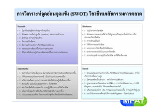 W6, T2 ,T3, S1,S2,O7) 2.แสดงบทบาทสภาวะผูนําแหงวิชาชีพรวมกับสาขาอื่นๆ และเปนสวนสําคัญในการสนับสนุนใหเกิดการใชยาอยาง ถูกตองเหมาะสม (S1, S3, O2, O3, W3, W4, W7) 3.สรางเครือขายเขมแข็งระหวางวิชาชีพเภสัช กับสมาคมวิชาชีพอื่น แพทย พยาบาล (O5, S1, W3, W4) 4.พัฒนาเภสัชกรการตลาดรุนใหม ที่มีความรู ทักษะ และคุณธรรม โดยรวมมือกับภาคการศึกษาในการพัฒนา หลักสูตร และการเรียนการสอน (W5 ,W7, T5) 5.สรางระบบ การตรวจสอบ ความสามารถของเภสัชกรผูปฏิบัติวิชาชีพ และองคกรที่เภสัชกรการตลาดปฏิบัติงาน เพื่อสรางมาตรฐาน โดยรวมมือกับสภาวิชาชีพ (O3, O4, T2, S1,O7) 6.สรางการยอมรับในวิชาชีพเภสัชกรการตลาด กับประชาชน (O3, O4, S3, S7)