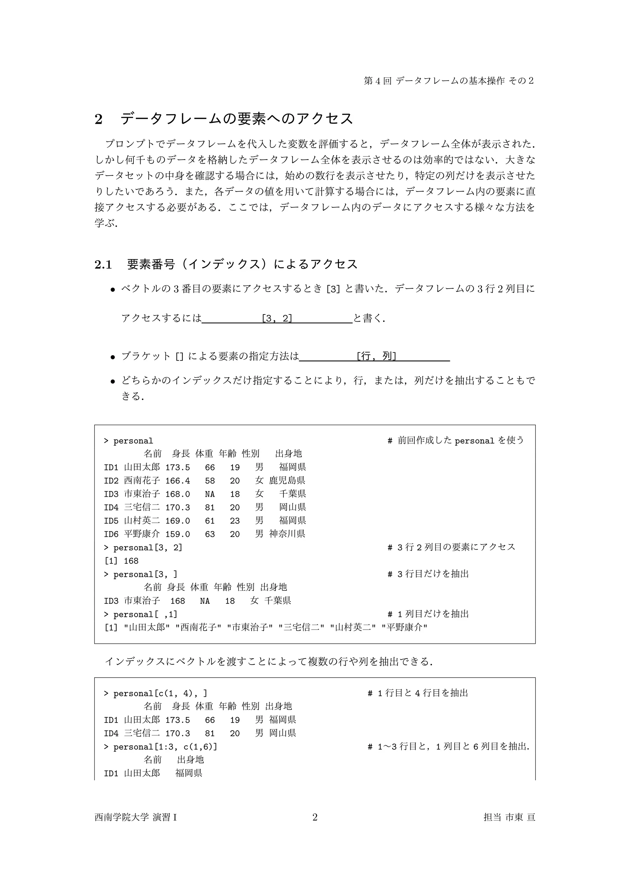 The document appears to be notes or examples from an R programming tutorial. It includes examples of various R functions such as subsetting vectors and data frames using logical operators and indices, calculating summary statistics, and binding columns. The examples demonstrate basic operations for manipulating and analyzing data in R.