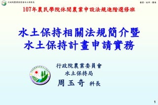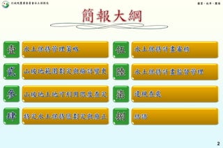 本文件介绍了水土保持相关法规及实践,包括水土保持管理策略与气候变化对灾害频率的影响。它强调了水土保持法的立法目的和管理架构,并列举了与山坡地保育相关的条例与规范。最终目的是提高水土资源保护、减少灾害及促进土地合理利用。