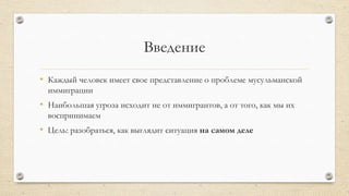 Документ разбивает мифы о мусульманской иммиграции в Европу, утверждая, что настоящую угрозу представляют не иммигранты, а предвзятое восприятие общества. Статистика показывает, что текущий рост мусульманского населения в Европе вызван не только иммиграцией, но и рождаемостью, где мусульмане составляют около 3-4% от всего населения. Автор призывает к критическому анализу информации и большей толерантности к иммигрантам.
