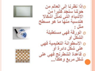 تتناول الوثيقة الأشكال الهندسية الموجودة في العالم من حولنا، سواء المسطحة أو المجسمة، وتستعرض أهمية معرفة المساحة والحجم لتلك الأشكال. كما تطرح مجموعة من الأسئلة حول تصنيع خزانات وأشياء أخرى باستخدام هذه الأشكال، بالإضافة إلى كيفية حساب المساحة والحجم لأشكال مختلفة.