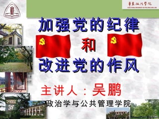 本讲座由吴鹏主讲,强调党的纪律和作风的重要性,指出这两者是政党健康发展的关键。党的纪律涵盖多个方面,为党内生活提供规范,而作风则关乎党形象与人心。强调历史经验与优良传统,倡导在新时代背景下强化党的纪律性与作风建设。