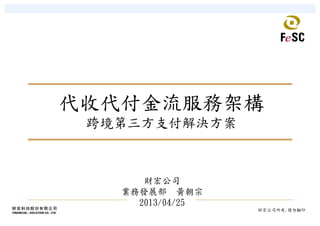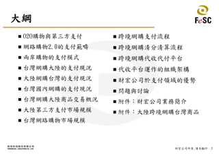 本文件介绍了財宏公司提供的跨境第三方支付解决方案,包括两岸支付模式、网络购物的现状以及支付工具的使用情况。文中详细分析了台湾和大陆的网络购物市场规模及支付流程,并提出了对双方消费者的支付体验影响的讨论。附录中包含了财宏公司的业务介绍及大陆跨境网购台湾商品的信息。