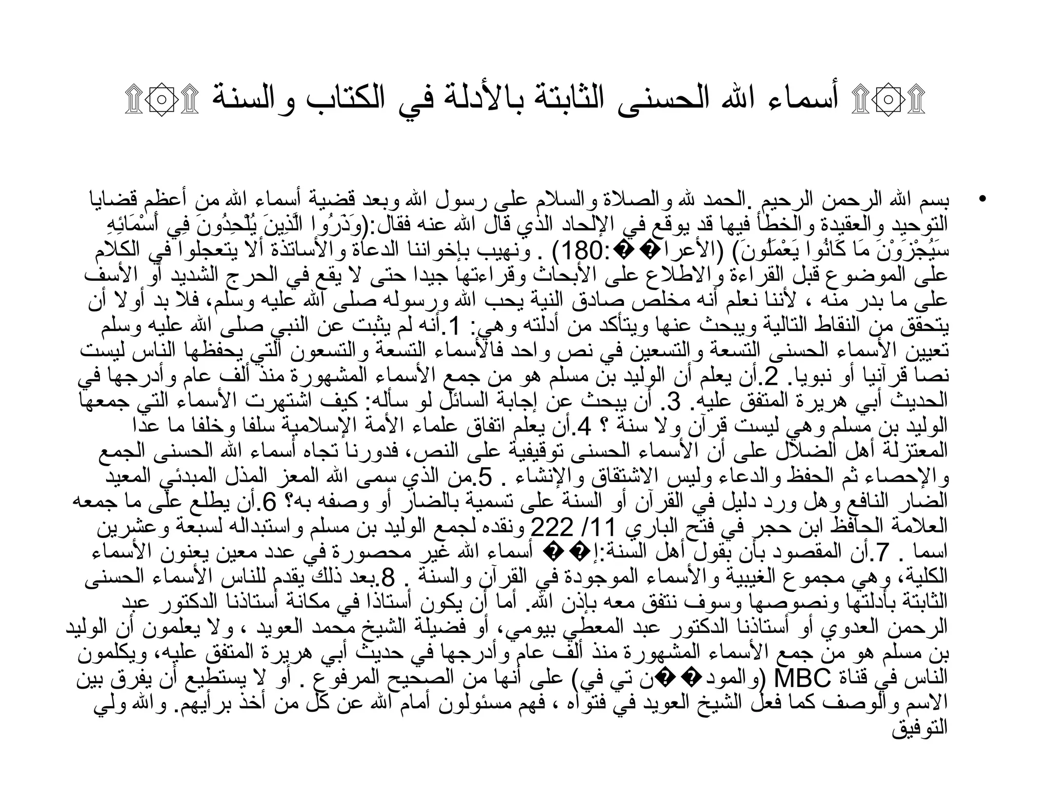 تناقش الوثيقة أسماء الله الحسنى وأحكامها في العقيدة الإسلامية، موضحة أن الأسماء ليست محصورة فيما يروى عن النبي، وأن الجمع بين الأسماء يأتي من الأبحاث ومن علم السلف. كما تحذر من الأخطاء في هذا الموضوع وتؤكد أن الأسماء الحسنى توقيفية، تتطلب دليلا من الكتاب والسنة.