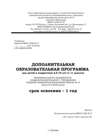 Документ представляет собой дополнительную образовательную программу для детей и подростков в возрасте от 6,5 до 18 лет, разработанную МБОУ СОШ № 23 г. Гуково. Программа направлена на развитие личности учащихся через участие в различных направлениях внеурочной деятельности, таких как научно-познавательное, военно-патриотическое, художественно-эстетическое и спортивно-оздоровительное. Основной целью программы является формирование интереса к выбранной деятельности и создание развивающей среды для индивидуального проявления детей.