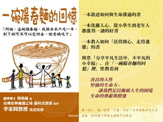 这本书通过一碗阳春面传递了生命的尊严和价值,讲述了在困境中如何相互支持和关爱。书中通过一个罹患癌症的母亲与 her孩子们的故事,强调了分享与善良的重要性。面对生活困境,乐观的态度和相互关怀让人们找到了幸福与希望。