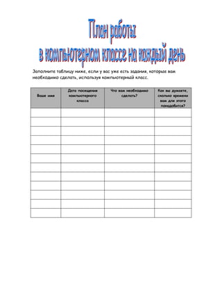 Документ представляет собой таблицу для заполнения, в которой необходимо указать задания, требуемые для выполнения в компьютерном классе. У参与者 также спрашивают дату посещения, предполагаемое время выполнения и имя. Это поможет организовать и планировать использование компьютерного класса.