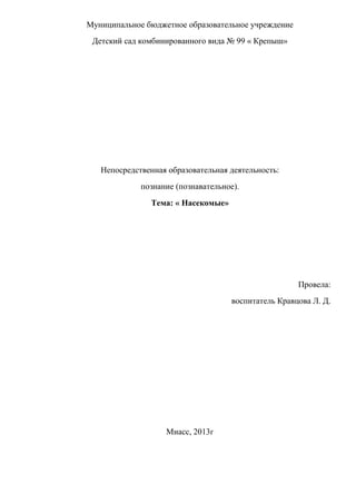 В детском саду комбинированного вида №99 'Крепыш' прошло занятие на тему 'насекомые', проводимое воспитателем Кравцовой Л.Д. Основные цели заключались в обучении детей активно отвечать на вопросы, развивать речь и произношение, а также знакомить с характеристиками различных насекомых через игры и загадки.