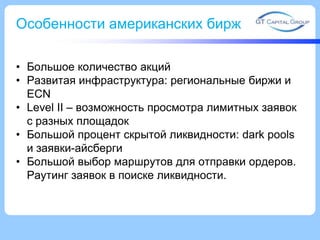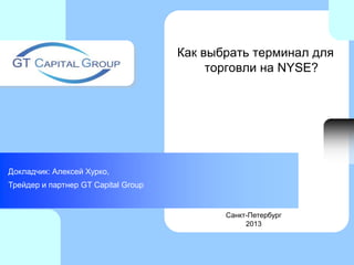 Документ предоставляет рекомендации по выбору торговых терминалов для торговли на NYSE, рассматривая особенности терминалов для разных типов трейдеров, включая инвесторов, дейтрейдеров и скальперов. Упоминаются ключевые функции, такие как доступ к лимитным заявкам, настраиваемые горячие клавиши и глубина рынка. Рекомендуются конкретные терминалы: gt trader и gt web trader для начинающих, takion и fusion для опытных трейдеров, а sterling trader pro для скальперов.