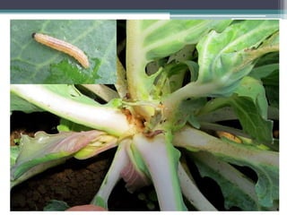 الكرنب أبي دقيق هو حشرة بيضاء اللون تحتوي على علامات سوداء، تتغذى اليرقات على النباتات من العائلة الصليبية مما يؤدي إلى أضرار جسيمة، خاصة في فصلي الخريف والشتاء. تدابير المكافحة تشمل جمع اليرقات يدويًا وتنظيف الحقول بالإضافة إلى استخدام المبيدات الكيميائية إذا لزم الأمر. تُعتبر الديدان والنمل من الآفات الأخرى التي تصيب الكرنب وتؤثر على نموه.