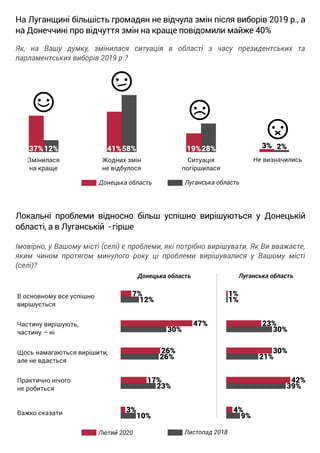 Регіональне дослідження громадської думки проведене в Донецькій та Луганській областях Фондом «Демократичні ініціативи» імені Ілька Кучеріва та Центром політичної соціології (із залученням мережі фірми «Юкрейніан Соціолоджі Сервіс») протягом 18 лютого – 2 березня 2020 року. Загалом у кожній з областей було опитано по 500 респондентів за вибіркою, що репрезентує доросле населення областей (за винятком окупованих територій). Вибірка репрезентативна за такими показниками як вік, стать та місце проживання. Теоретична похибка вибірка не перевищує 3,5%.