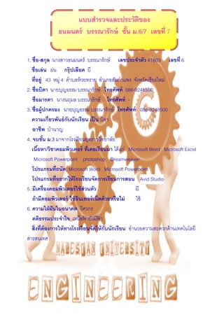 บรรณารักษ์ เลขประจาตัว 41803 เลขที่ 6 ชื่อเล่น ฝน กรุ๊ปเลือด บี ที่อยู่ 43 หมู่ 4 ตาบลห้วยทราย อาเภอสันกาแพง จังหวัดเชียงใหม่ 2. ชื่อบิดา นายบุญธรรม บรรณารักษ์ โทรศัพท์ 086-9248500 ชื่อมารดา นางนฤมล บรรณารักษ์ โทรศัพท์ - 3. ชื่อผู้ปกครอง นายบุญธรรม บรรณารักษ์ โทรศัพท์ 086-9248500 ความเกี่ยวพันธ์กับนักเรียน เป็น บิดา อาชีพ บานาญ 4. จบชั้น ม.3 มาจากโรงเรียนยุพราชวิทยาลัย เนื้อหา/วิชาคอมพิวเตอร์ ที่เคยเรียนมา ได้แก่ Microsoft Word Microsoft Excel Microsoft Powerpoint photoshop Dreamweaver โปรแกรมที่ถนัด Microsoft Word Microsoft Powerpoint โปรแกรมที่อยากให้โรงเรียนจัดการเรียนการสอน Avid Studio 5. มีเครื่องคอมพิวเตอร์ใช้ส่วนตัว มี ถ้ามีคอมพิวเตอร์ ใช้อินเทอร์เน็ตด้วยหรือไม่ ใช้ 6. ความใฝ่ฝันในอนาคต วิศวกร คติธรรมประจาใจ เหนือฟ้ ายังมีฟ้ า สิ่งที่ต้องการให้ทางโรงเรียนจัดให้กับนักเรียน อานวยความสะดวกด้านเทคโนโลยี สารสนเทศ แบบสารวจและประวัติของ ธนมนตร์ บรรณารักษ์ ชั้น ม.6/7 เลขที่ 7
