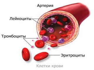 Презентация описывает кровоснабжение организма человека и строение сердца, а также функции различных клеток крови. Основное внимание уделяется эритроцитам, тромбоцитам и лейкоцитам, включая их функции, состав и период жизни. Документ подчеркивает жизненно важную роль крови в транспортировке кислорода и питательных веществ, а также в защите организма от инфекций.