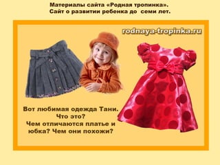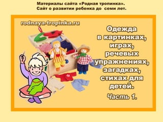 Сайт 'Родная тропинка' посвящен развитию детей до семи лет и содержит информационные материалы по различным аспектам данного процесса. В документе также рассматриваются темы, связанные с одеждой, включая вязание и вышивку. Повторяющиеся упоминания о сайте подчеркивают его важность в контексте развития ребенка.