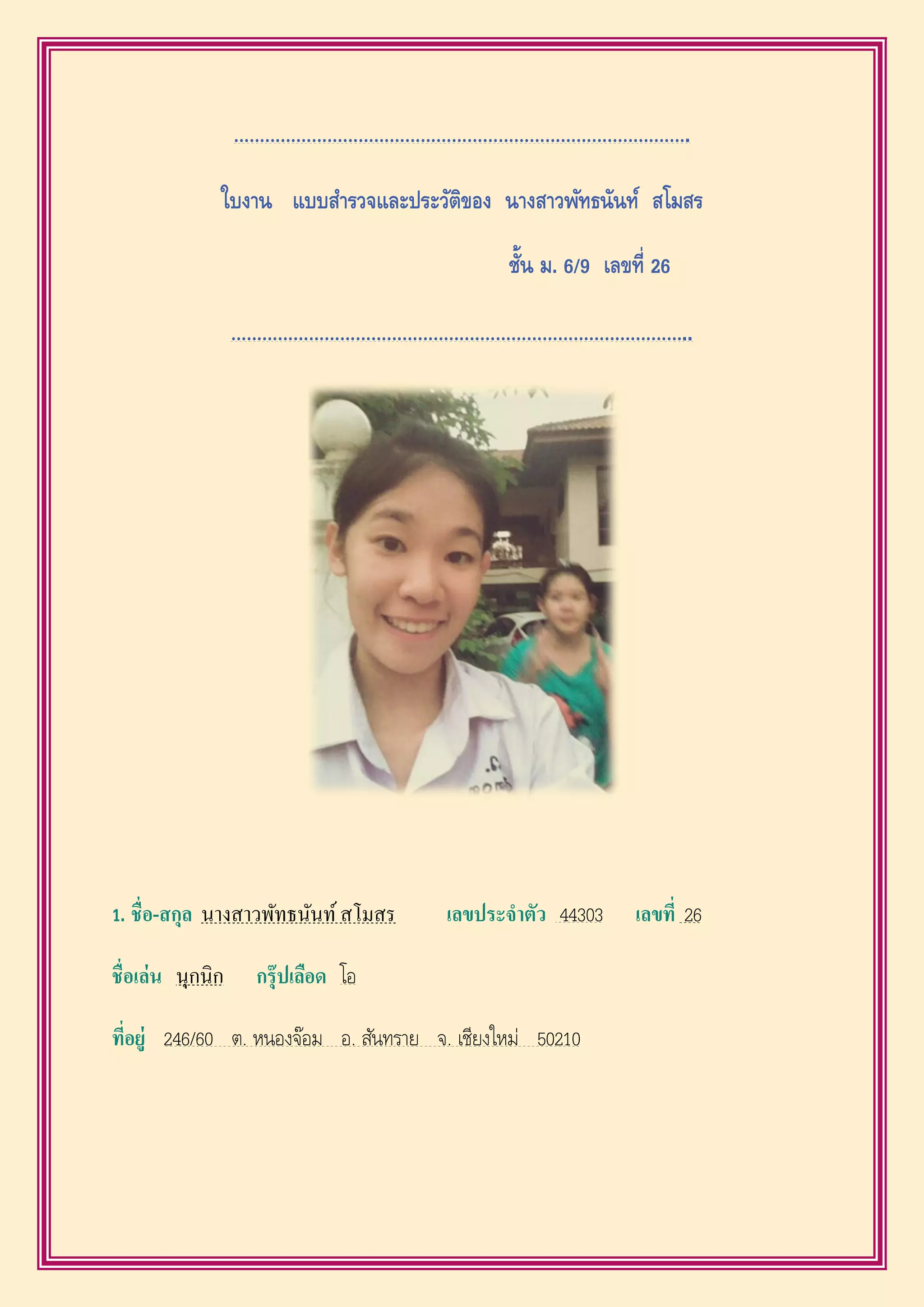 สโมสร ชั้น ม. 6/9 เลขที่ 26 …………………………………………………………………………….. 1. ชื่อ-สกุล นางสาวพัทธนันท์สโมสร เลขประจำตัว 44303 เลขที่ 26 ชื่อเล่น นุกนิก กรุ๊ปเลือด โอ ที่อยู่ 246/60 ต. หนองจ๊อม อ. สันทราย จ. เชียงใหม่ 50210