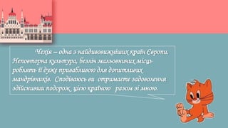 Чехія – одна з найдивовижніших країн Європи. Неповторна культура, безліч мальовничих місць роблять її дуже привабливою для допитливих мандрівників. Сподіваюсь, ви отримаєте задоволення здійснивши подорож цією країною разом з котом Кексом з Чернігівської обласної бібліотеки для дітей!