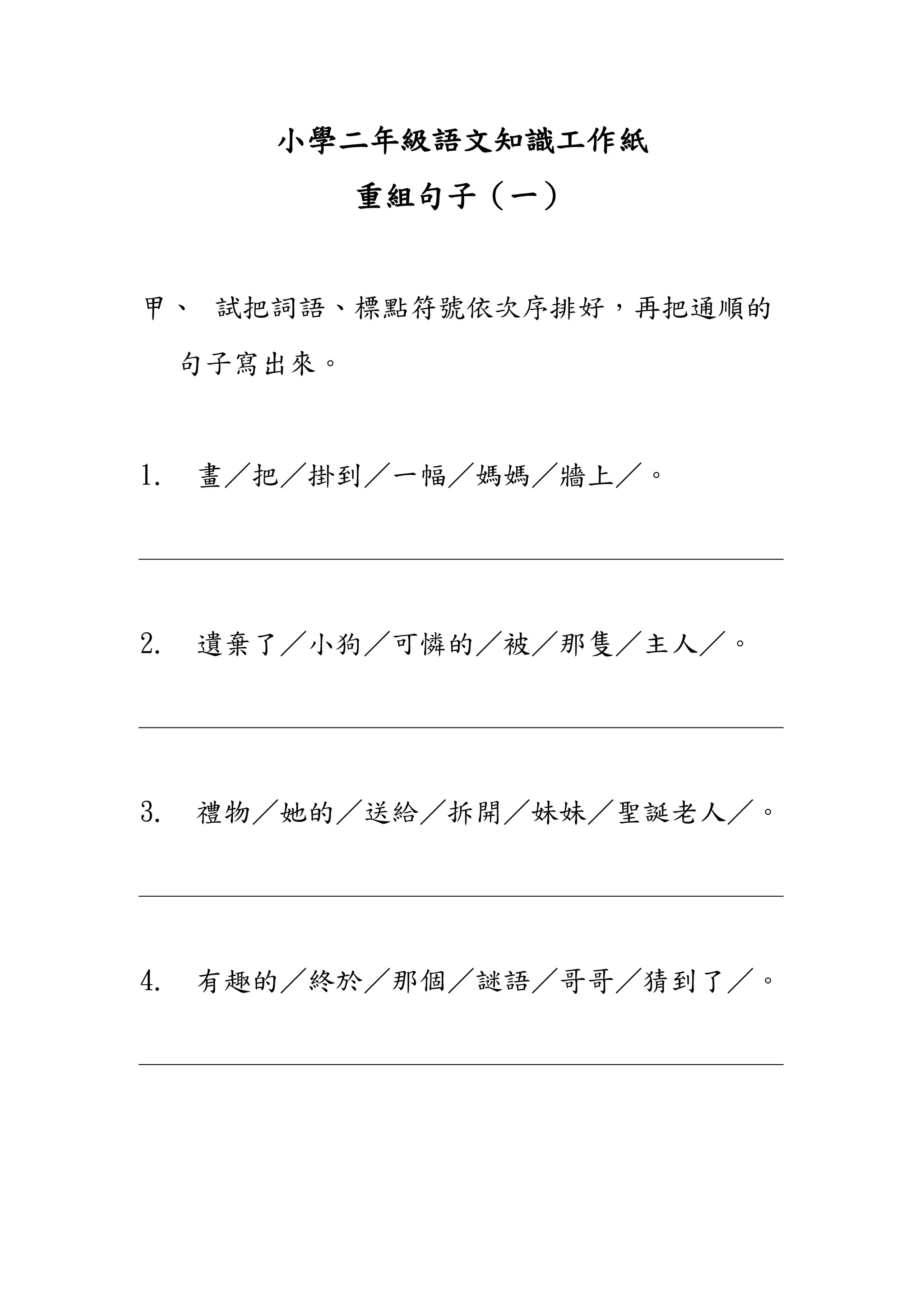 遺棄了/小狗/可憐的/被/那隻/主人/。 3. 禮物/她的/送給/拆開/妹妹/聖誕老人/。 4. 有趣的/終於/那個/謎語/哥哥/猜到了/。