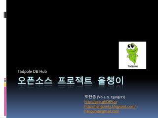 #2 Info page :(6.22 여게모 발표)http://onoffmix.com/event/161609.26. 공개SW개발지원과제 중간 보고회 발표. 부산 벡스코 세미나룸 103호22 분발표 5분 질답을 준비합니다.“오픈소스 프로젝트 올챙이” 라는 주재로 발표하게 된 올챙이 쥔장올챙이 아빠한금이 조현종입니다.