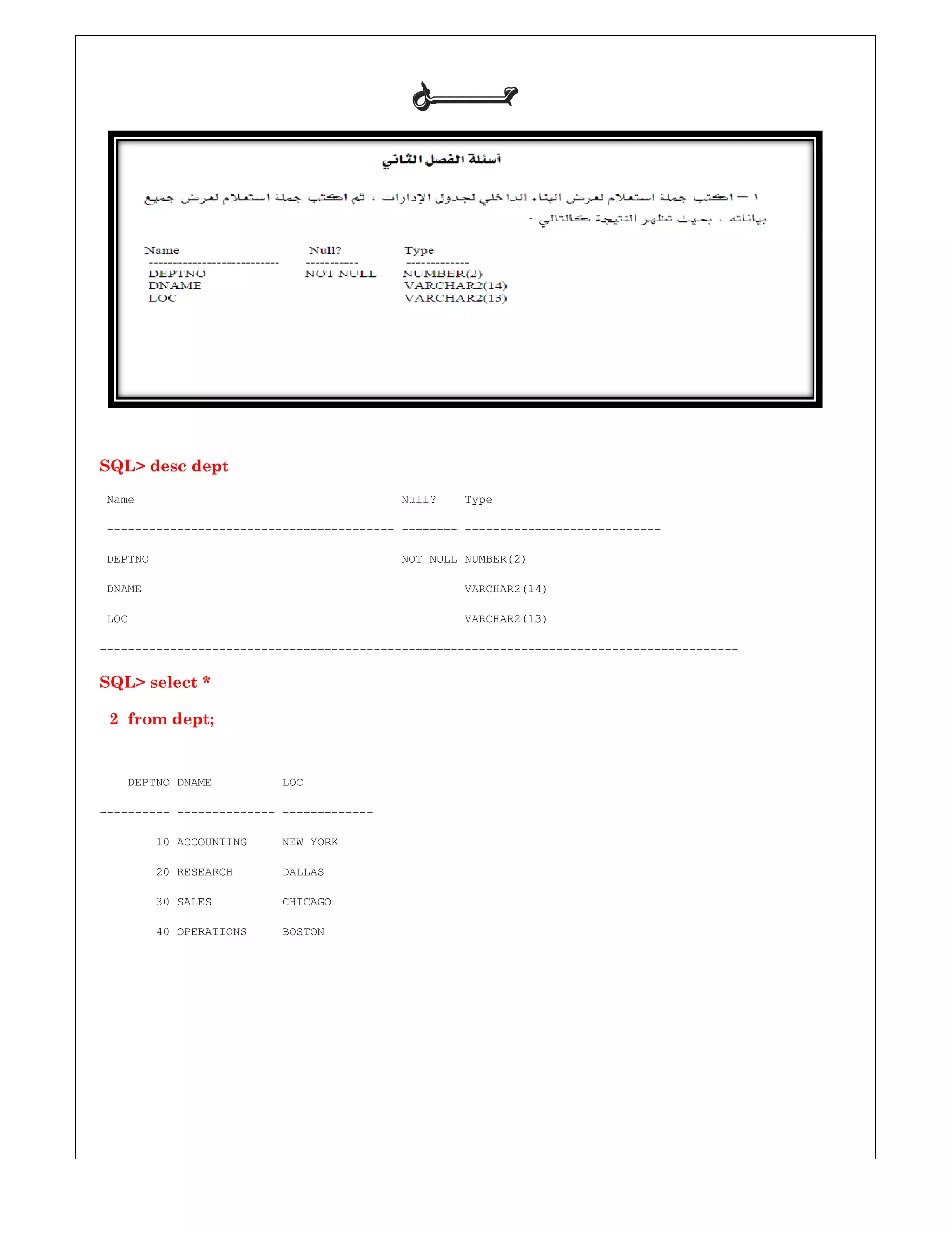 The document contains examples of SQL queries on Oracle database tables. It shows how to retrieve data from the DEPT and EMP tables, including selecting columns, filtering rows, sorting results, and performing calculations. Various SQL functions are demonstrated like INITCAP, LENGTH, SUBSTR, and date formatting. The last section aggregates data from the EMP table using MAX, MIN, SUM, and AVG.