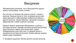 Документ описывает основные системы человеческого организма, включая покровную, опорно-двигательную, пищеварительную, дыхательную, кровеносную, выделительную, половую, нервную, эндокринную и систему органов чувств. Каждая система выполняет важные функции, такие как защита, поддержание гомеостаза, обмен газов, циркуляция крови и восприятие окружающей среды. Эти системы взаимодействуют друг с другом, обеспечивая нормальное функционирование организма.