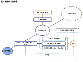 ①現状把握 ③目標再定義 ④意義の創出 ⑤方針・KPI・重要アクション 設定 ⑥チーム体制構築と最適配置 ⑦推進システムの構築 会社の課題・願望 ②役割再定義 ⑧初期の成果(モメンタム)創出 結果 ⑨学習 基本動作の全体像 ⑩個人目標設定と評価 98