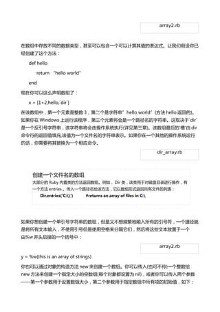 大部分的 Ruby 内置类的方法返回数组。例如, Dir 类,该类用于对磁盘目录进行操作,有