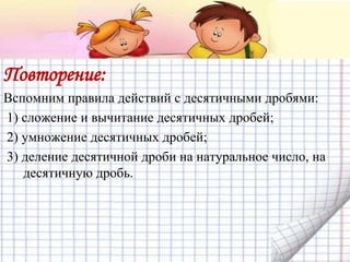 Документ содержит объяснение понятий делителей и кратных чисел, включая правила операций с десятичными дробями и примеры. Определяются делители натуральных чисел и приводятся примеры, показывающие, какие числа являются делителями и кратными. В конце содержатся вопросы для проверки знаний по теме.