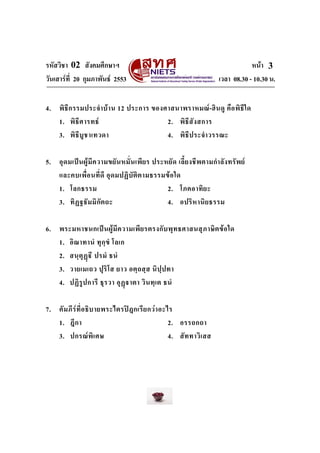 หนา วันเสารที่ 20 กุมภาพันธ 2553 เวลา 08.30 - 10.30 น. 17 51. ศาสนามีความสําคัญอยางไรตอสังคม 1. ทําใหเกิดความสามัคคีมีเอกภาพ 2. เปนบอเกิดของการสรางสรรควัฒนธรรม 3. ตอบสนองความตองการดานจิตใจของคนในสังคม 4. เปนหลักจริยธรรมควบคุมความประพฤติของกลุมคน 52. ขอใดกลาวถูกตองเกี่ยวกับศาสนาพราหมณ-ฮินดู 1. เปนศาสนาที่ไมมีศาสดา 2. กอนพุทธกาลเรียกวาศาสนาพราหมณ 3. ในยุคพระเวทนับถือพระเจาองคเดียว 4. ยกยองพระพรหมวายิ่งใหญกวาเทพเจาองคอื่น 53. วันพิพากษาในศาสนาอิสลามมีชื่อเรียกวาอะไร 1. วันสิ้นโลก 2. วันฟนคืนชีพ 3. วันแหงศรัทธา 4. วันกําหนดชะตา 54. เรื่องใดปรากฏอยูในคัมภีรไบเบิลใหม 1. เรื่องราวชีวิตของพระเยซู 2. การเผยแผศาสนาของโมเสส 3. การเทศนาสั่งสอนธรรมของพระเยซู 4. ประวัติศาสตรชนชาติยิวในสมัยอับราฮัม