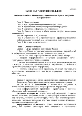 Документ представляет проект закона Кыргызской Республики, направленный на защиту детей от информации, которая может нанести вред их здоровью и развитию. Он включает общие положения, классификацию информационной продукции, требования к обороту такой продукции и ответственность за правонарушения в этой сфере. Основной целью закона является регулирование доступа детей к информации и создание безопасной информационной среды.