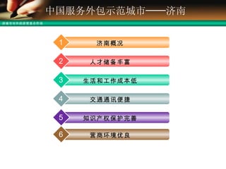济南是中国东部沿海经济大省山东省的省会,具有丰富的人才储备、低廉的生活和工作成本、便捷的交通通讯和完善的知识产权保护,使其成为服务外包示范城市。该市提供多元化的产业支撑,包括金融、信息技术等,并通过各种政策扶持外包产业的发展。济南每年培养大量相关专业毕业生,营商环境优良,吸引着众多企业和投资。