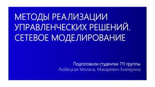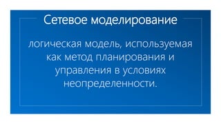 Документ описывает методы сетевого моделирования, использующиеся для эффективного планирования и управления проектами в условиях неопределенности. Основные методы, такие как метод критического пути и PERT, позволяют выявлять взаимосвязи между этапами реализации и оптимизировать порядок их выполнения. В работе также рассматриваются инструменты визуализации, включая сетевые графики и диаграммы Ганта, которые помогают в управлении проектами.