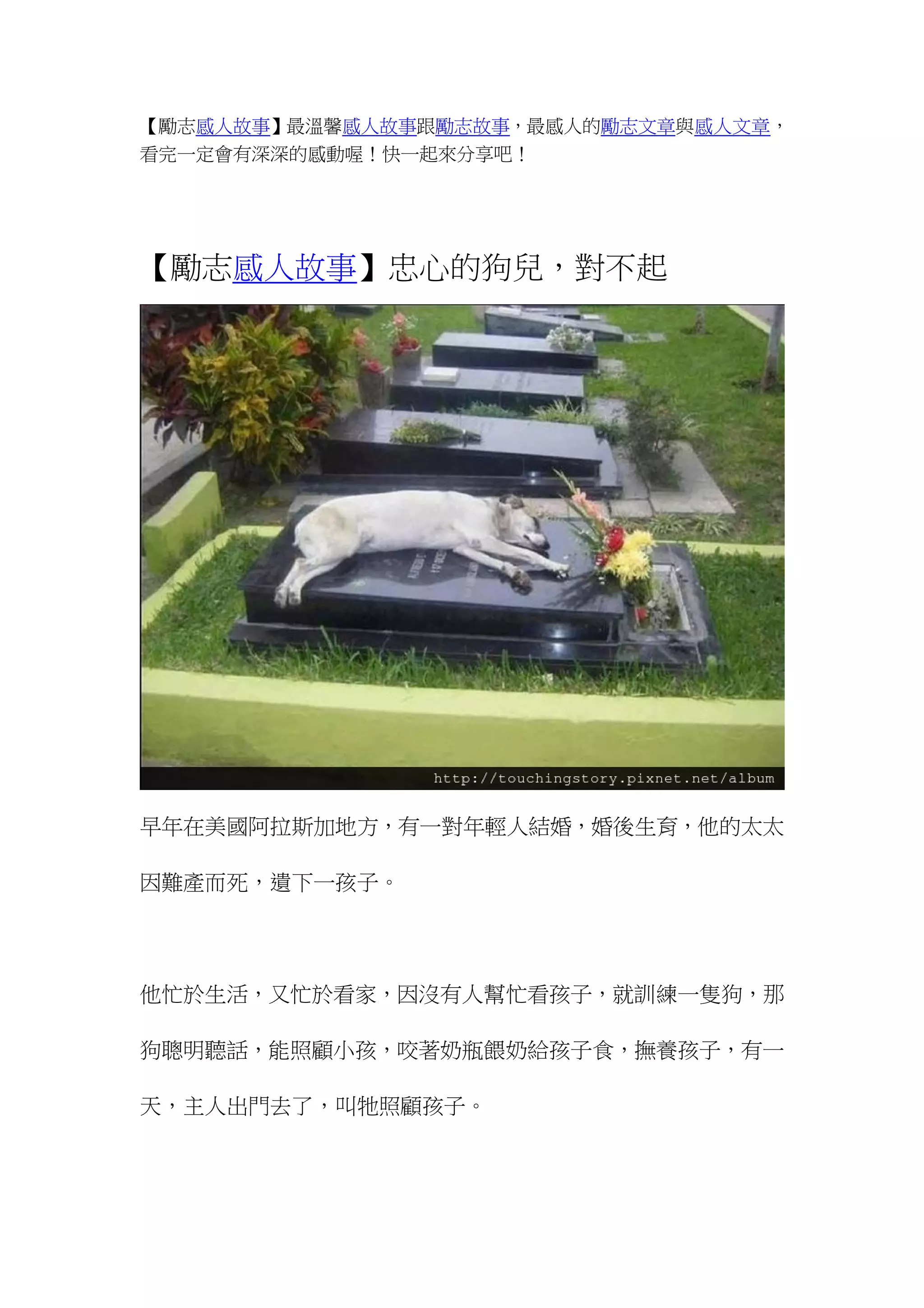 【勵志感人故事】最溫馨感人故事跟勵志故事,最感人的勵志文章與感人文章, 看完一定會有深深的感動喔!快一起來分享吧! 【勵志感人故事】忠心的狗兒,對不起 早年在美國阿拉斯加地方,有一對年輕人結婚,婚後生育,他的太太 因難產而死,遺下一孩子。 他忙於生活,又忙於看家,因沒有人幫忙看孩子,就訓練一隻狗,那 狗聰明聽話,能照顧小孩,咬著奶瓶餵奶給孩子食,撫養孩子,有一 天,主人出門去了,叫牠照顧孩子。