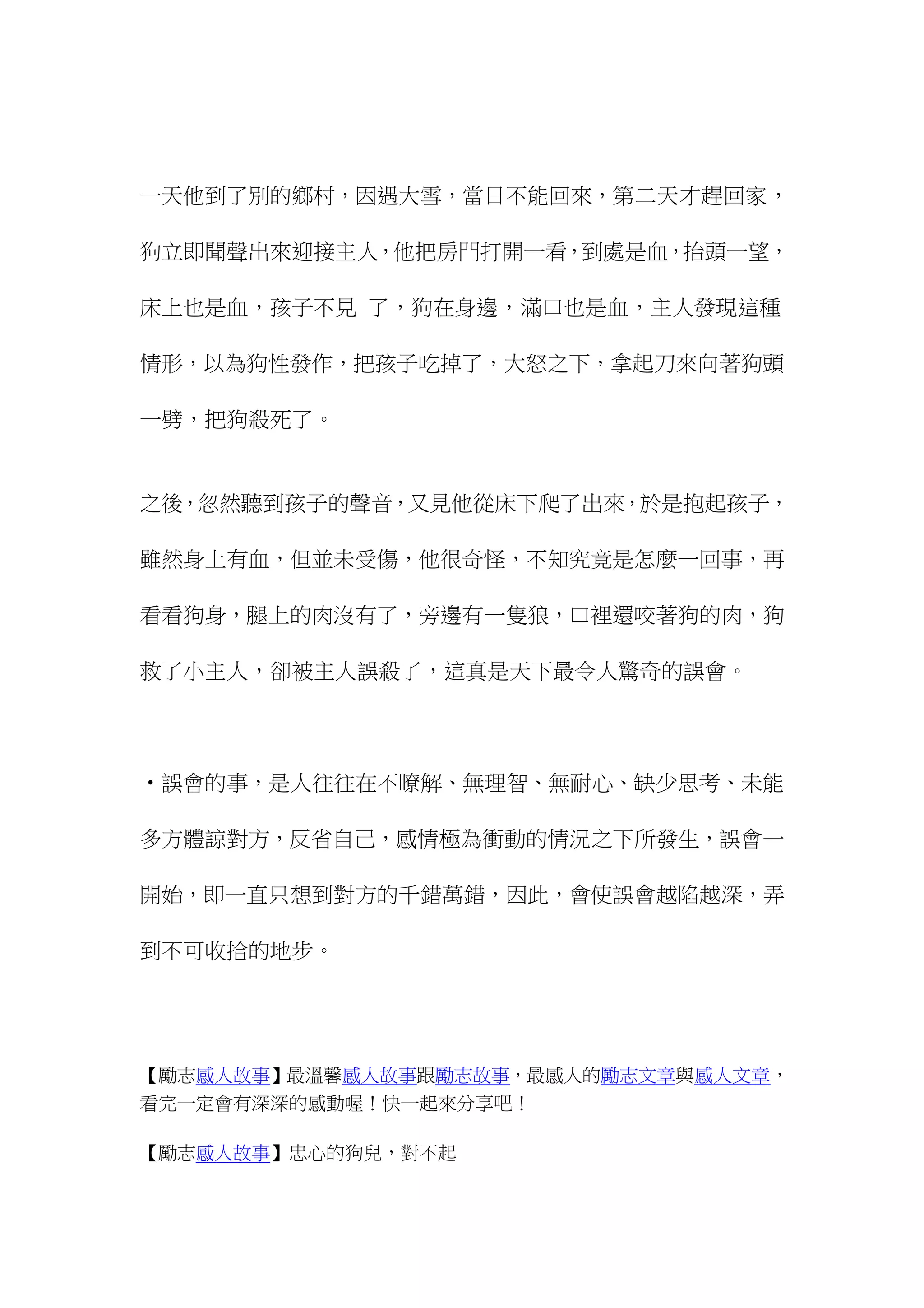 一天他到了別的鄉村,因遇大雪,當日不能回來,第二天才趕回家, 狗立即聞聲出來迎接主人,他把房門打開一看,到處是血,抬頭一望, 床上也是血,孩子不見 了,狗在身邊,滿口也是血,主人發現這種 情形,以為狗性發作,把孩子吃掉了,大怒之下,拿起刀來向著狗頭 一劈,把狗殺死了。 之後,忽然聽到孩子的聲音,又見他從床下爬了出來,於是抱起孩子, 雖然身上有血,但並未受傷,他很奇怪,不知究竟是怎麼一回事,再 看看狗身,腿上的肉沒有了,旁邊有一隻狼,口裡還咬著狗的肉,狗 救了小主人,卻被主人誤殺了,這真是天下最令人驚奇的誤會。 ‧誤會的事,是人往往在不瞭解、無理智、無耐心、缺少思考、未能 多方體諒對方,反省自己,感情極為衝動的情況之下所發生,誤會一 開始,即一直只想到對方的千錯萬錯,因此,會使誤會越陷越深,弄 到不可收拾的地步。 【勵志感人故事】最溫馨感人故事跟勵志故事,最感人的勵志文章與感人文章, 看完一定會有深深的感動喔!快一起來分享吧! 【勵志感人故事】忠心的狗兒,對不起
