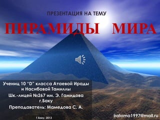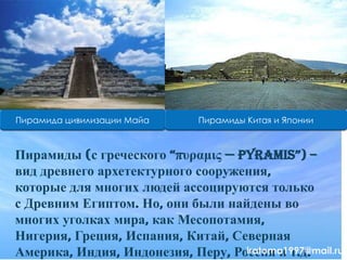 Документ представляет собой презентацию о пирамидах мира, подготовленную ученицами 10-го класса, в которой рассматриваются множество древних пирамид, включая египетские, китайские, японские и майянские. Обсуждаются различные теории их назначения, включая их функции как архитектурных, астрономических и даже энергетических сооружений. Поднимются также вопросы о технологиях их строительства и возможных цивилизациях, способных возвести такие сооружения.
